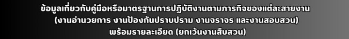 – ข้อมูลเกี่ยวกับคู่มือหรือมาตรฐานการปฏิบัติงานตามภารกิจของแต่ละสายงาน